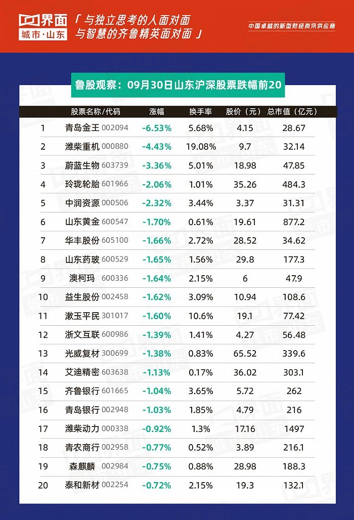 9月30日,山东213股上涨,4股持平,36股下跌。
