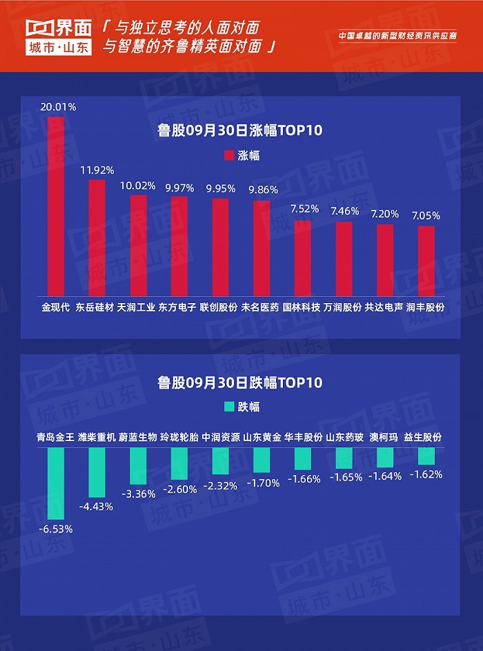 原标题:鲁股观察 | 9月30日:山东213只个股上涨,金现代再现“20cm”涨停