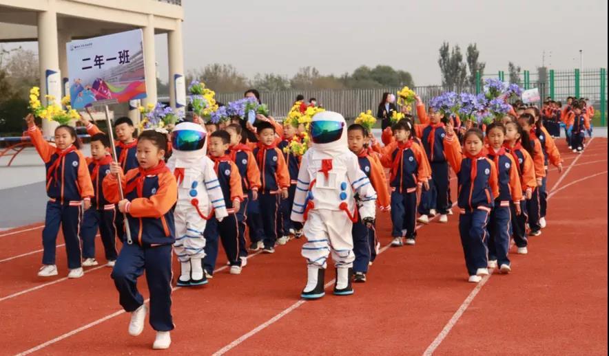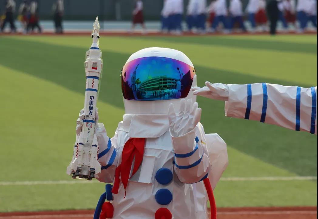 到了主席台前,每个班都带来了自己的特色节目。今年各班的主题大多以航空航天为主。二年级一班的小朋友们还身着了太空服,向刚刚在16日凌晨顺利搭乘神舟十三号载人飞船升空的翟志刚、王亚平、叶光富3名宇航员致敬。初一(3)班的孩子们用诗朗诵的形式,表达了作为中国人突破自我、成就航天梦的自豪。