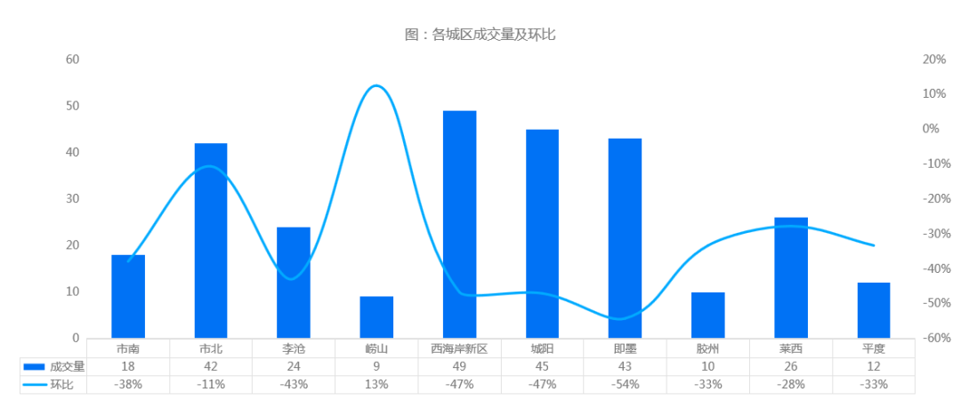 区域方面,热度最高的是西海岸新区,网签量为49套;其次为城阳区,以网签量45套的成绩位列第二;即墨和市北不分伯仲,网签量分别为43套和42套。另外,莱西和李沧相对表现也比较亮眼,网签套数分别为26和24套。