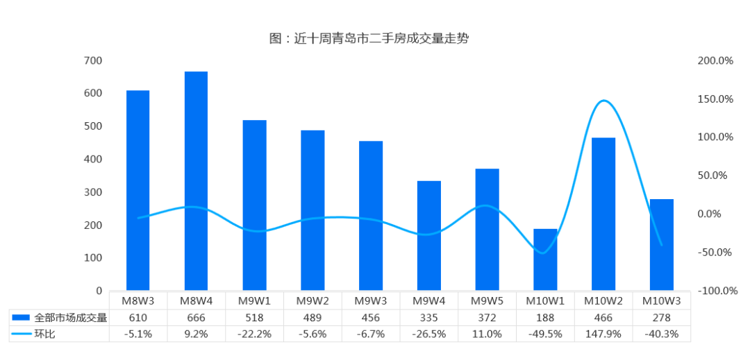 据贝壳研究院数据,10月第3周,青岛市全市二手房成交量278套,仅仅超过十一黄金周期间成交数据,创下近十周以来次低记录,环比猛降40.3%。