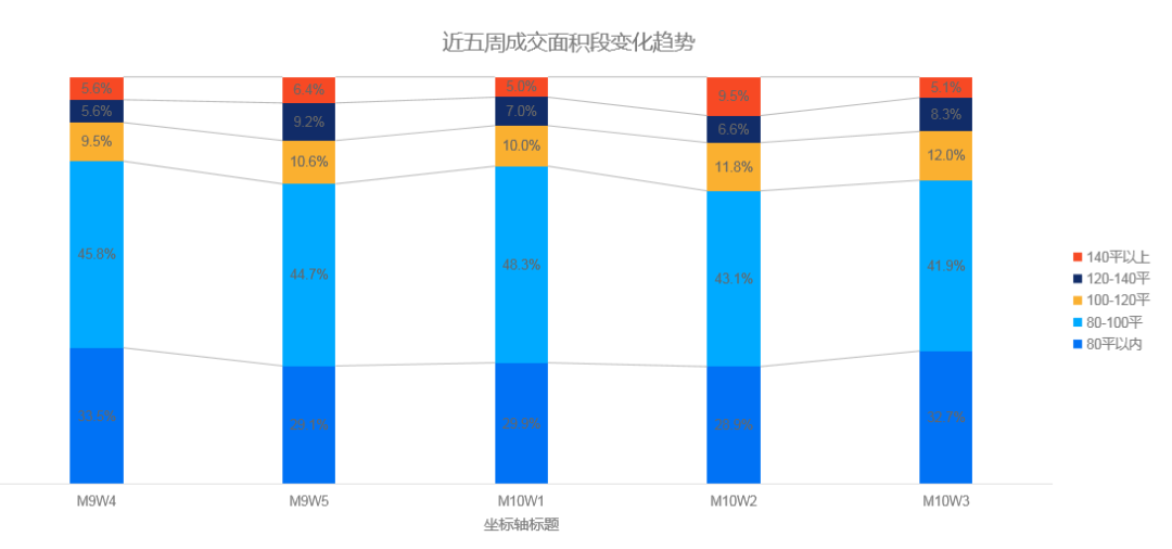 从成交面积段变化趋势图中可以看出,80㎡以下户型成交占比近四周以来持续增长,刚需群体需求正在逐渐延伸,成交占比增幅较大。另外,100-120㎡户型也有0.2%的增幅,这个户型区间做套三房的可能性较大,二孩家庭的需求也逐渐上升,刚改范围扩大。平均来看,上周二手房成交套均面积为90.1㎡,环比下降4.0%。