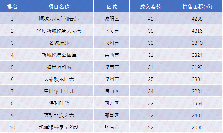 具体到楼盘成交量,我们可以看到,前十项目销售面积起伏变化较小,成交套数也基本成平稳态势。其中,万科新盘顺城万科海潮云起项目以42套的网签量位列榜首,销售面积4238㎡。平度新城悦隽大都会项目“黑马”逆袭,上周成交35套,销售面积4316㎡。胶州市名城府邸项目以成交33套、销售面积3840㎡的成绩位列前三。