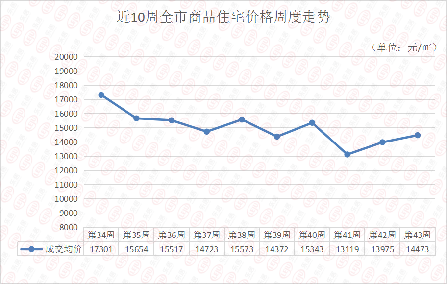 从成交均价来看,上周青岛楼市成交均价为14473元/㎡,较上上周13975元/㎡有轻微的上涨,涨幅约3.56%。但从近十周成交均价走势来看,上周成交均价相对处于一个较低的区间。