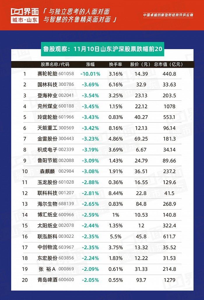 青岛市跌幅榜首:赛轮轮胎(601058),跌幅10.01%,股价14.39元,总市值440.8亿元;