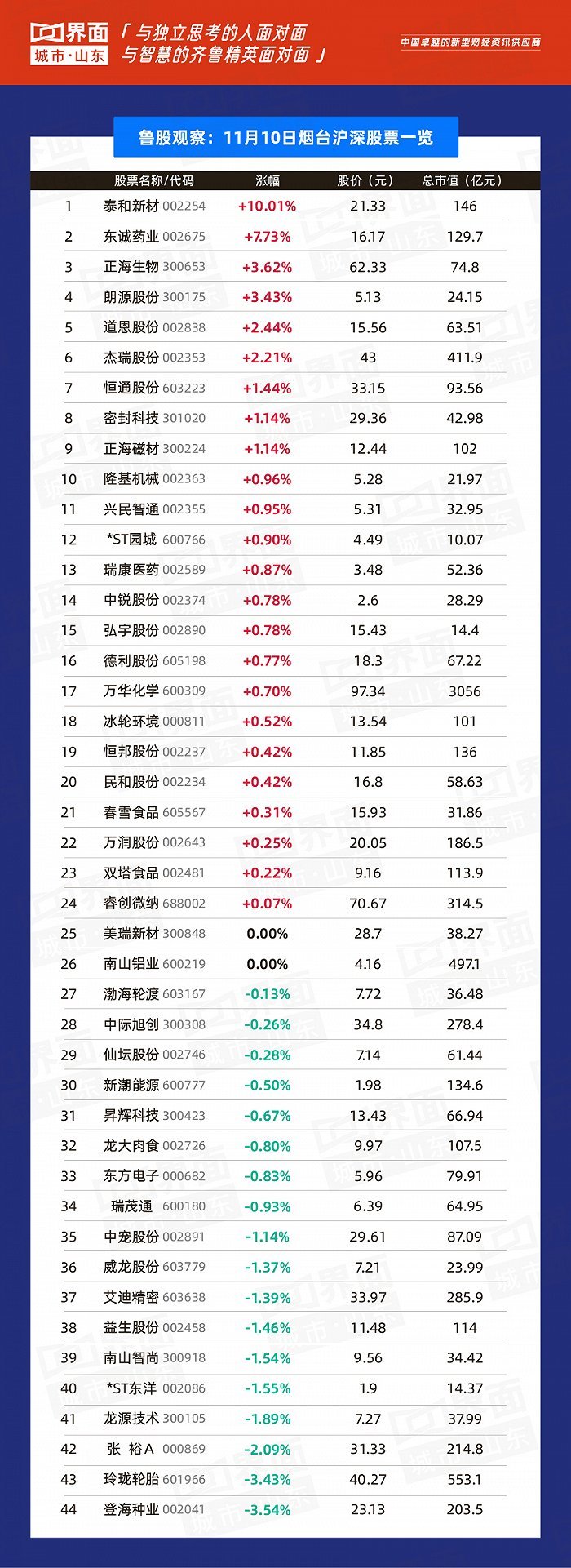 烟台市涨幅榜首:泰和新材(002254),涨幅10.01%,股价21.33元,总市值146亿元;