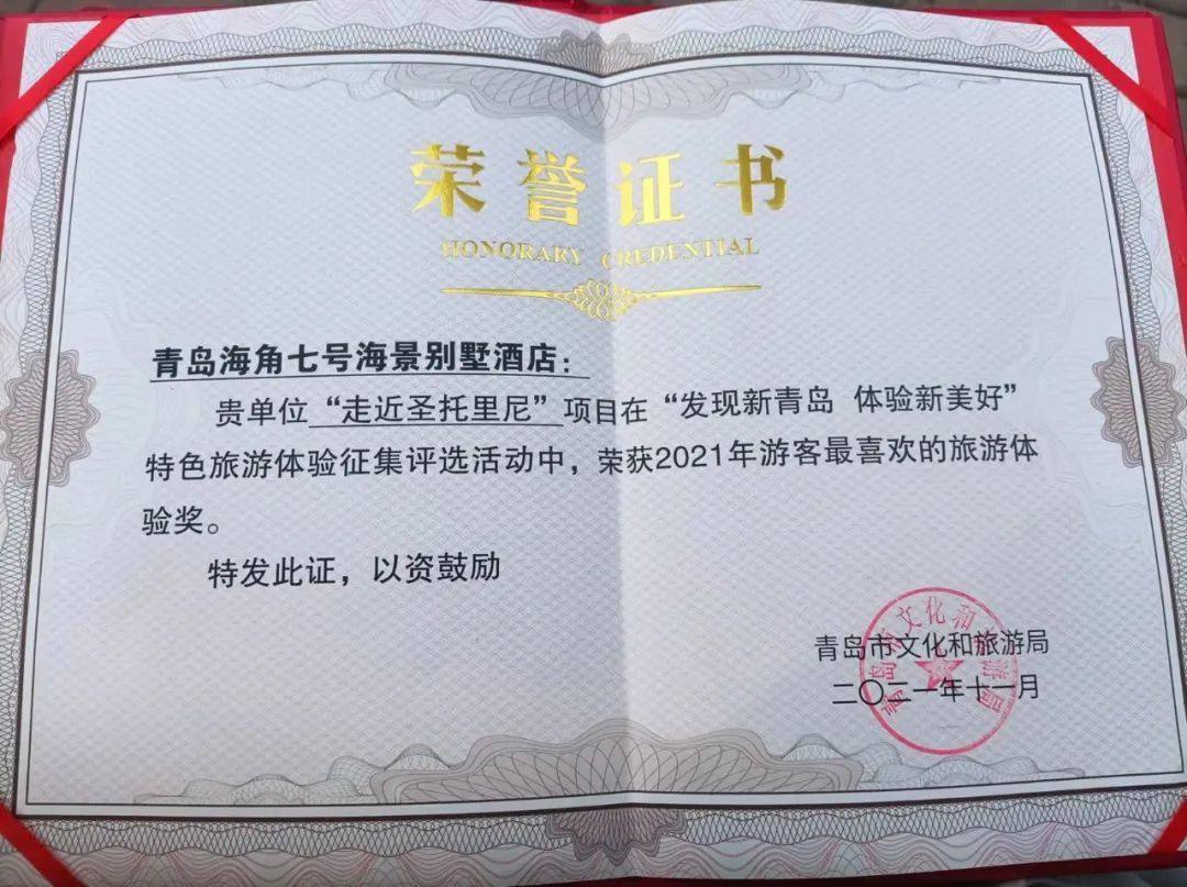 近日,由青岛市文化和旅游局组织策划的“发现新青岛 体验新美好”2021特色旅游体验征集评选活动结果正式揭晓,青岛海角七号民宿“走近圣托里尼”项目荣获2021游客最喜欢的旅游体验奖。