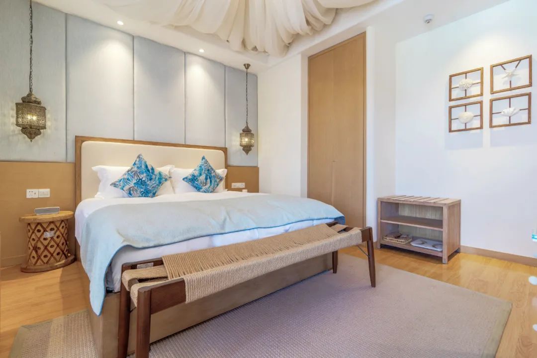 此外,12个房间从房型名称,装饰风格等全部以希腊艺术为主题,每一处细节都萃取希腊艺术精髓,白色帷幔、白色拱门、吊椅、墙面上海洋元素的装饰画等落入房间,在车马红尘中,给人以净土般的感受。