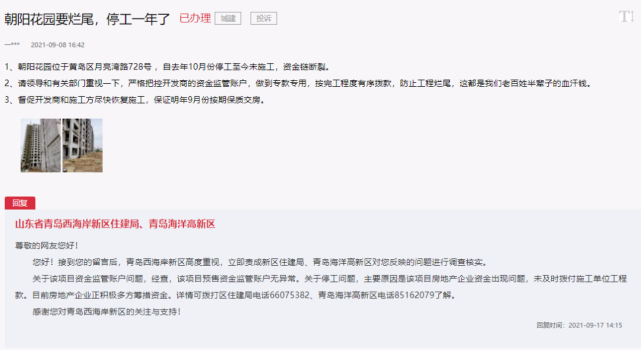 对此,青岛西海岸新区住建局、青岛海洋高新区在调查落实后表示,该项目预售资金监管账户无异常。停工原因是该项目房地产企业资金出现问题,未及时拨付施工单位工程款。目前房地产企业正积极多方筹措资金。