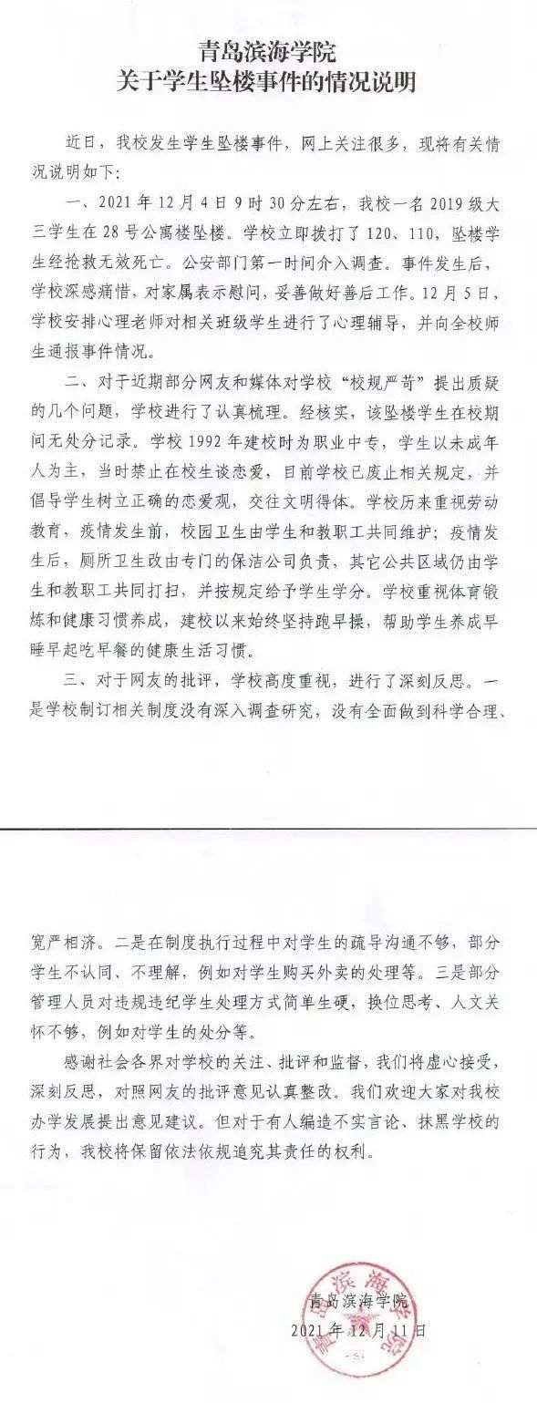 青岛滨海学院回应学生跳楼事件
