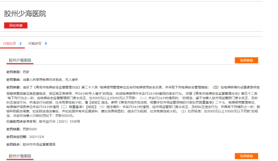 近日,胶州少海汇医院因在电梯使用中未实行24小时值班及涉嫌假冒专利两项违规违法行为,被胶州市市场监督管理局依法给予行政处罚。