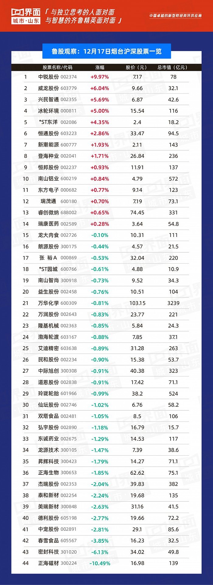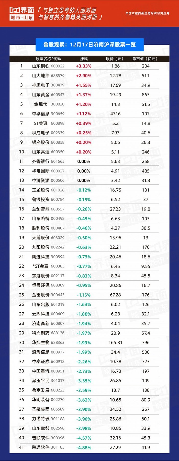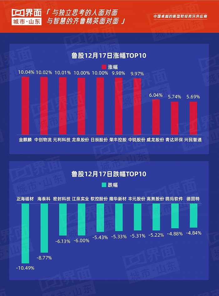 原标题:鲁股观察|12月17日:山东77股上涨,金麒麟领衔5只个股涨停
