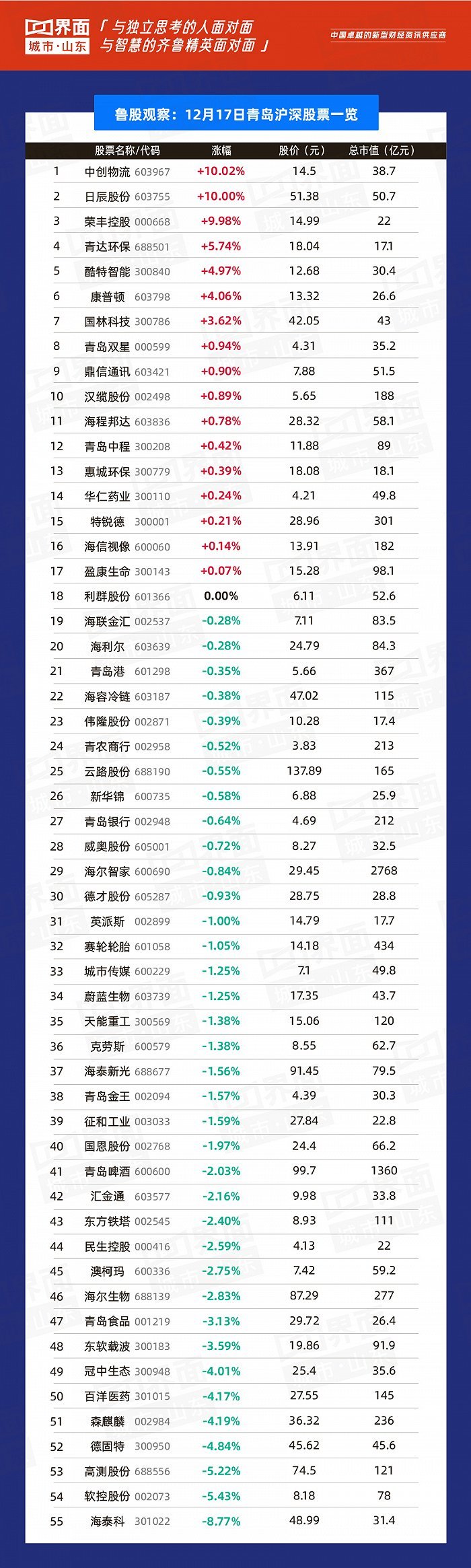 青岛市涨幅榜首:中创物流(603967),涨幅10.02%,股价14.5元,总市值38.7亿元;