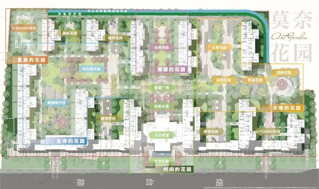 让建筑与自然共舞,文澜锦园园区规划强调空间序列感与延续性,规划“一轴·两带·两庭”,还原对大自然的诗意想象,缓步慢行间,已入艺术画境。以“时间、冥想、大地、生命、星辰”五大主题花园,生成不同生活场景,在自然中社交往来,获得芬芳的疗愈与慰藉。