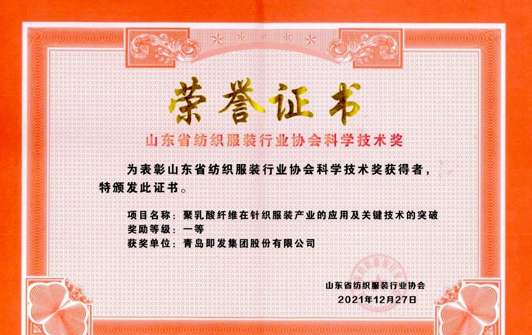 近日,2021山东省纺织服装行业科技创新大会在泰安召开。会议对2021年度山东省纺织服装行业协会科学技术奖获奖单位进行了表彰。我集团联合研发的“聚乳酸纤维在针织服装产业的应用及关键技术的突破”项目获得了2021山东省纺织服装协会科技奖一等奖。这是继2020年“聚酯纤维筒子纱超临界二氧化碳无水染色技术”摘得该评选一等奖后,即发再获此殊荣。