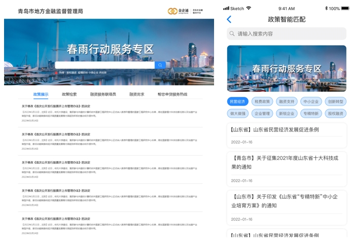 针对此次行动,金企通平台发挥“金融机构全覆盖、融资产品最多样、客户经理时刻在”的服务优势,设计开通“春雨行动”服务专区,增加“融资政策”查询模块,集中展示国家、省、市融资支持政策,公开政策解读员和融资服务联络员信息,同步实现移动端政策智能匹配功能,为企业一键匹配最佳政策方案。