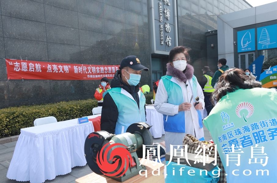 作为本次活动的重要组成部分,在会场一侧,由市南区新时代文明实践志愿服务总队、各街道志愿服务组织联合举办的“志愿起航 点亮文明”新时代文明实践志愿服务大集也热闹开市。这里聚焦群众日常需求和关心关注的热门话题,提供了急救知识普及、义务磨刀理发、免费医疗问诊等十余个服务项目,将文明实践延伸到百姓心坎,吸引了众多市民游客的热烈参与。