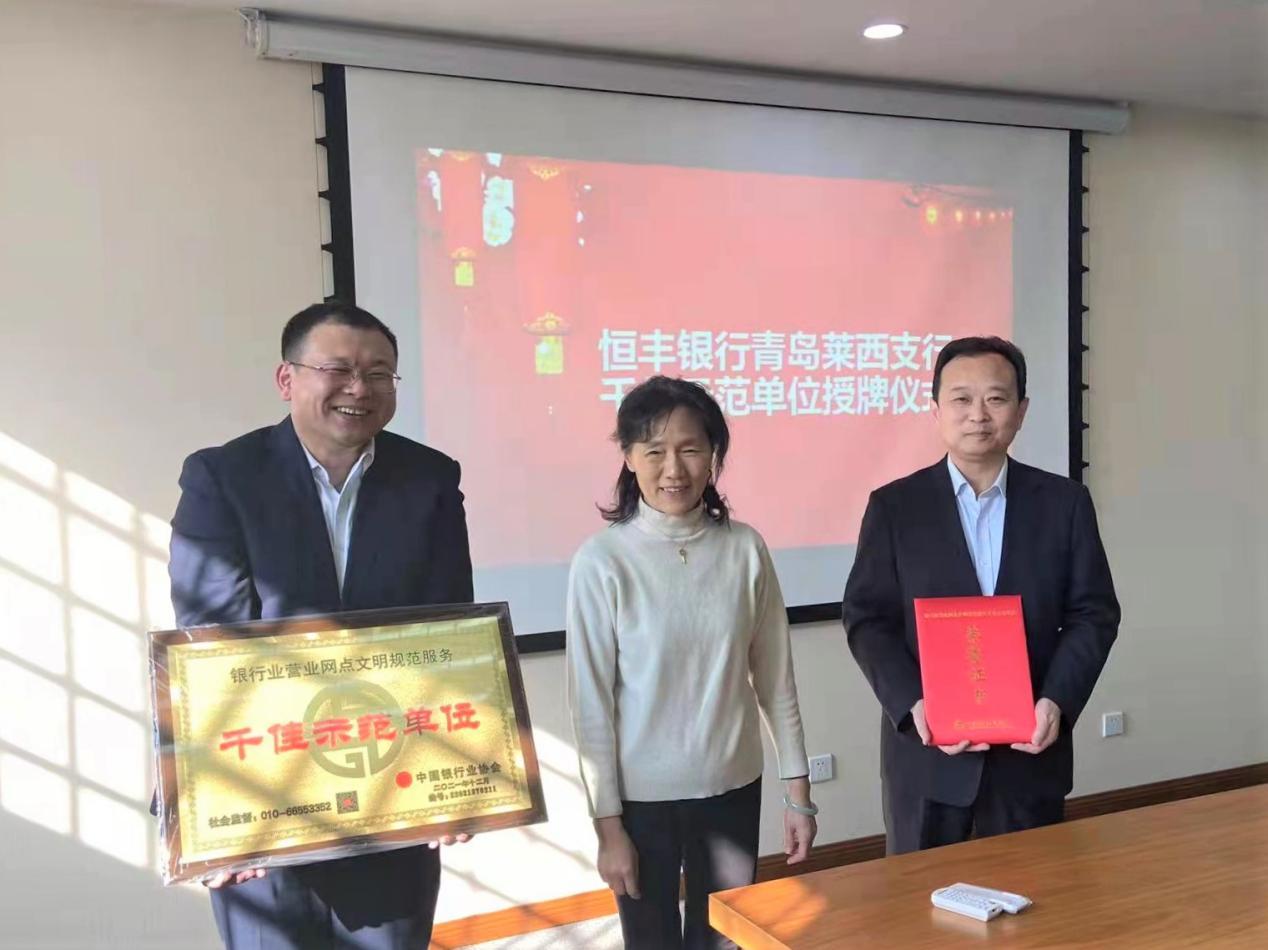 近日,中国银行业协会公布2021年银行业营业网点文明规范服务千佳示范单位创建工作评选结果,恒丰银行青岛莱西支行获评“千佳示范单位”。青岛市银行业协会专职副会长沙爱红,恒丰银行青岛分行党委委员、副行长王旭峰前往莱西支行参加授牌仪式,并就网点文明规范服务工作进行座谈交流。