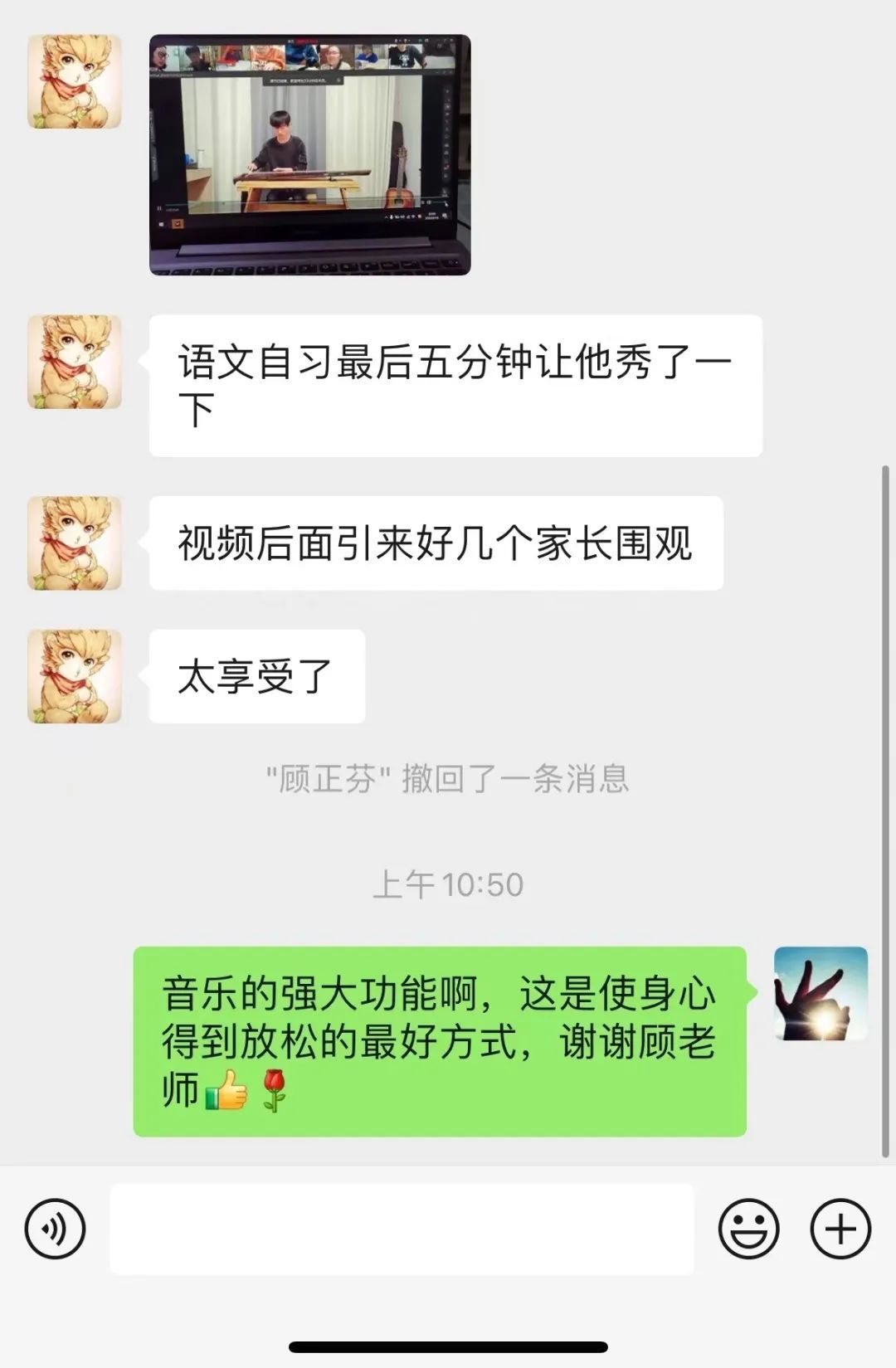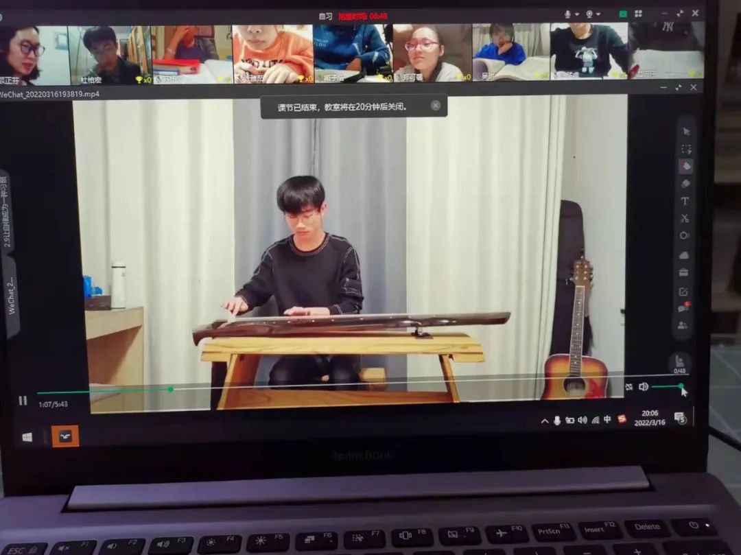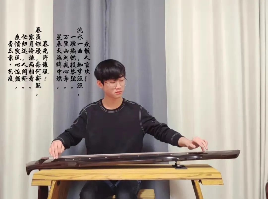 注:3月16日 高二9班classin线上教学——语文晚自习结束后五分钟,班主任顾正芬老师请器乐社团范志博同学即兴演奏古琴曲«流水»节本,获得了师生和家长的一致好评!