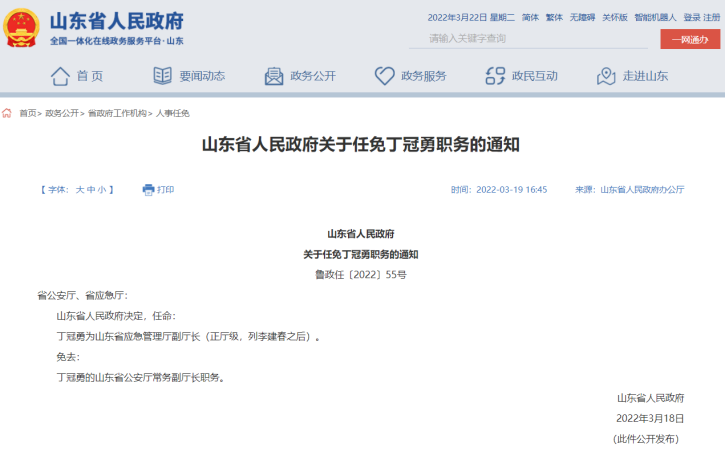 山东省人民政府决定,任命 丁冠勇为山东省应急管理厅副厅长 (正厅级,列李建春之后),免去丁冠勇的山东省公安厅常务副厅长职务。