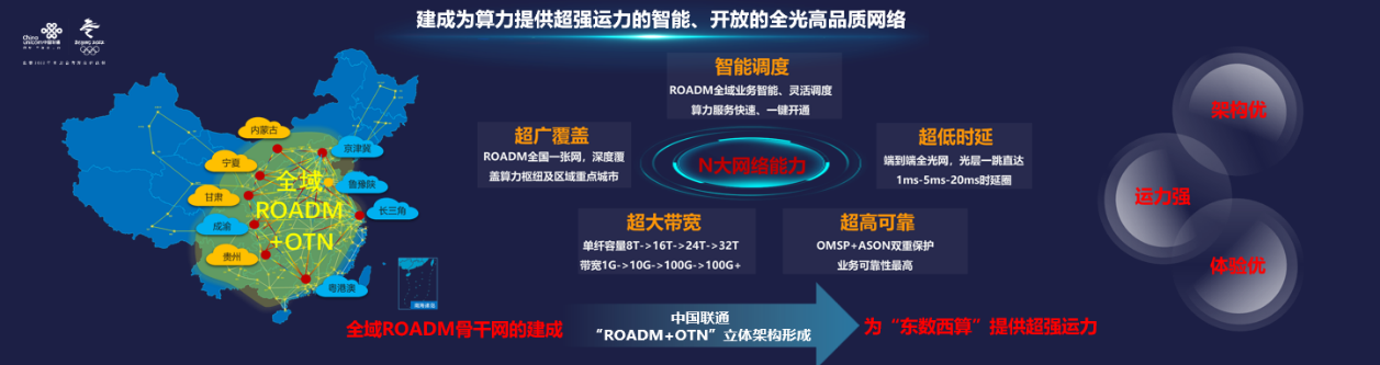 中国联通在世界电信和信息社会日当天,发布了中国联通算力时代全光底座,提供超广覆盖、超大带宽、超低时延、超高可靠、智能调度等网络能力。筑牢全光算力网络是实现高品质、高安全、高可靠的算力业务传送的关键所在。中国联通将勇当“国家队、主力军、排头兵”,持续将全光算力网络延伸覆盖至每个城市、每个乡村,实现品质联算、品质联企和品质联家的多业务综合承载,构建以算力为核心的算网融合新生态,积极推进“东数西算”战略落地实施,助力数字经济高质量发展。