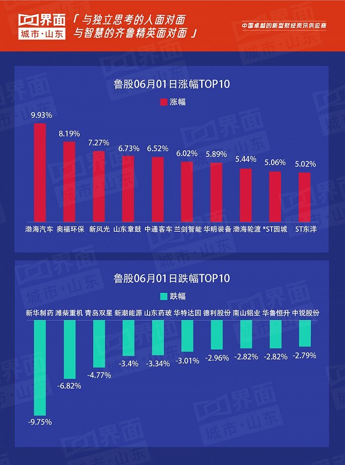 6月1日,山东省内沪深股票有147只个股上涨,109只个股下跌,9只个股持平。