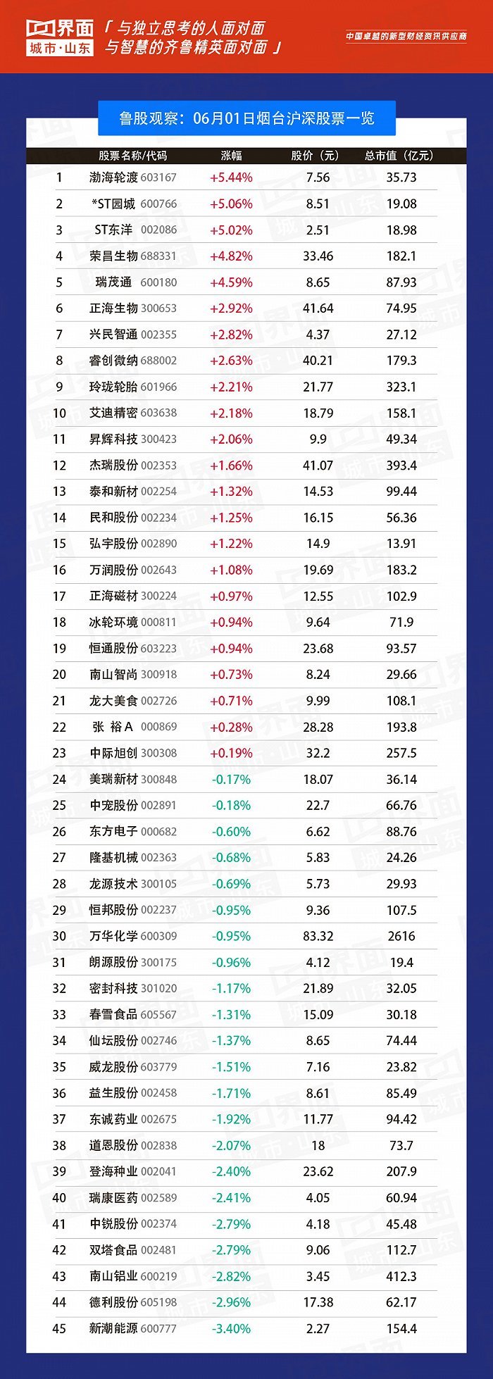烟台市涨幅榜首:渤海轮渡(603167),涨幅5.44%,股价7.56元,总市值35.73亿元;