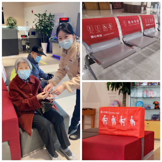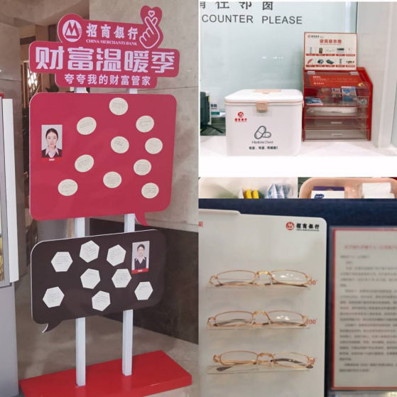 招商银行青岛分行每个网点均设置无障碍通道、爱心座椅和敬老专座,配备点钞扎把一体机、老花镜以及各类急救药品,改善老年人的金融服务环境。