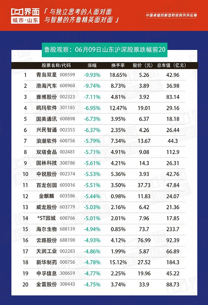 青岛市跌幅榜首:青岛双星(001219),涨幅-9.93%,股价5.26元,总市值42.96亿元;