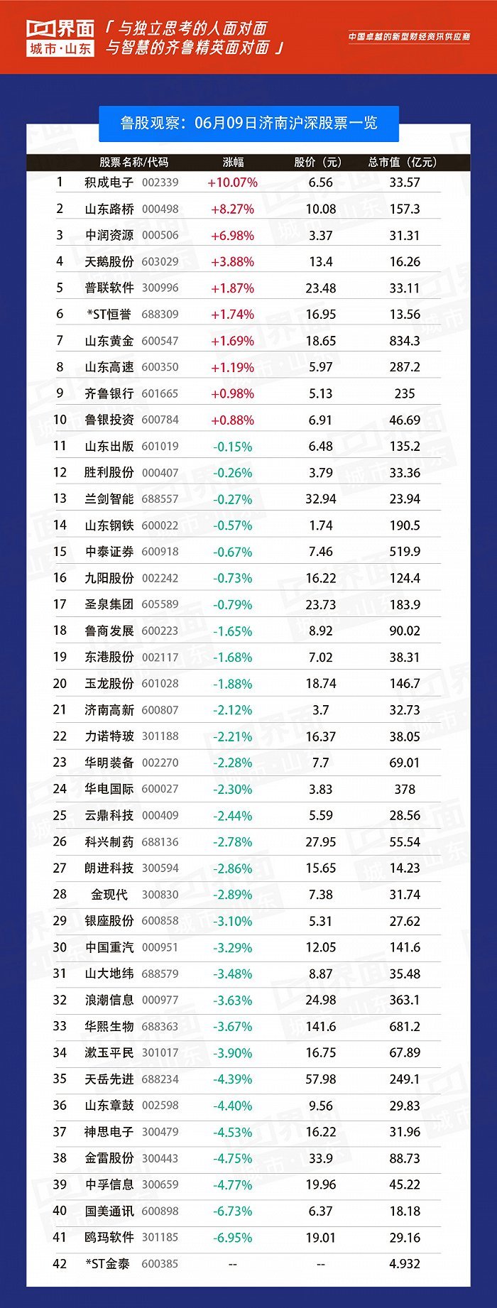 济南市涨幅榜首:积成电子(301185),涨幅10.07%,股价6.56元,总市值33.57亿;