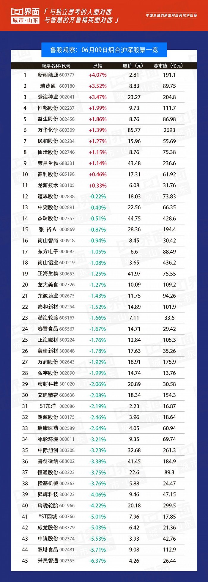 烟台市涨幅榜首:新潮能源(002335),涨幅4.07%,股价2.81元,总市值191.1亿元;