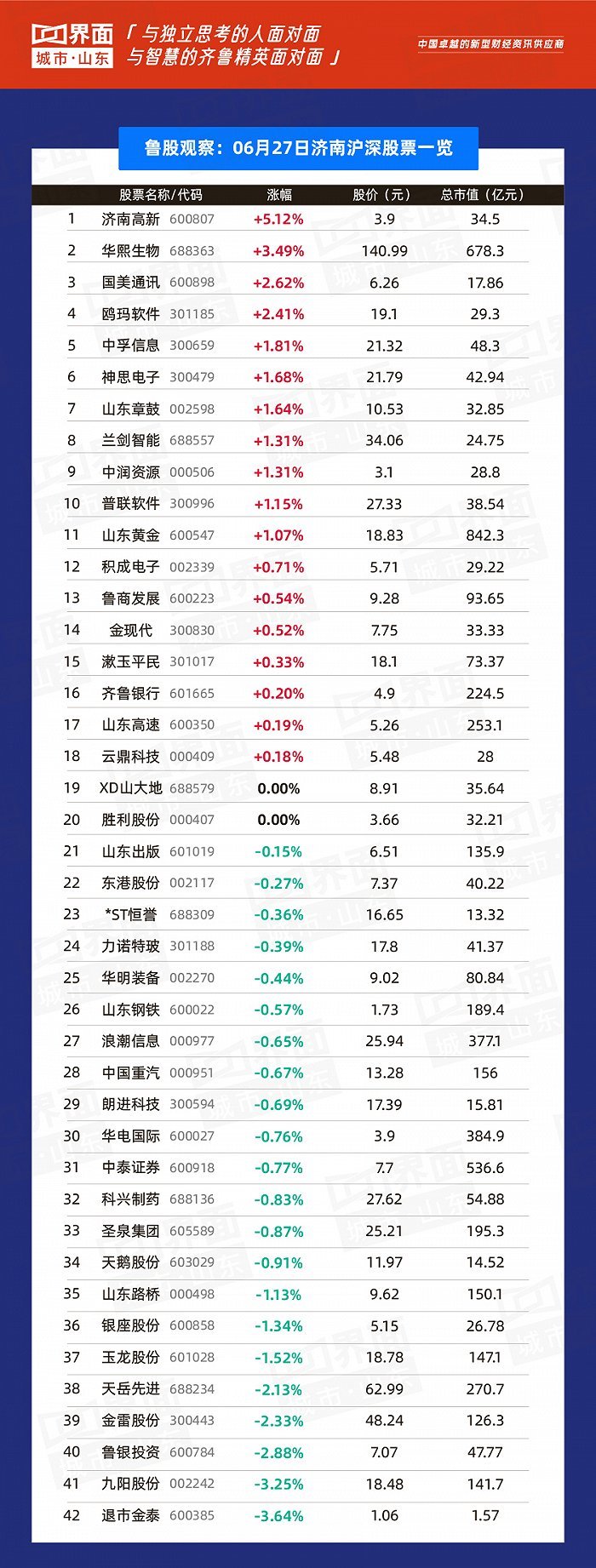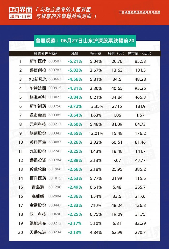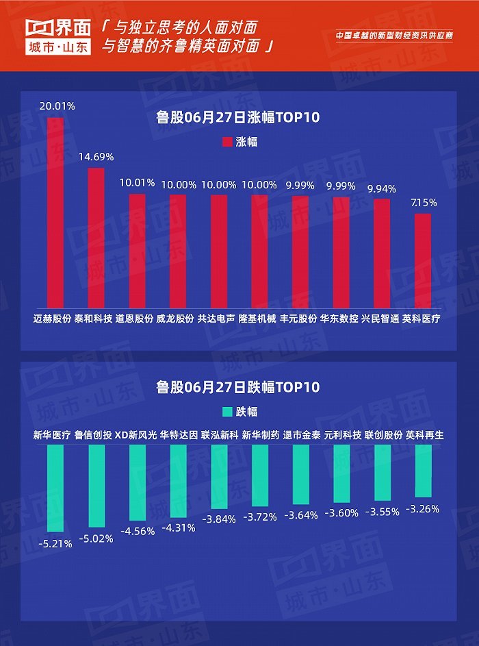 6月27日,山东146股上涨,10股持平,110股下跌。