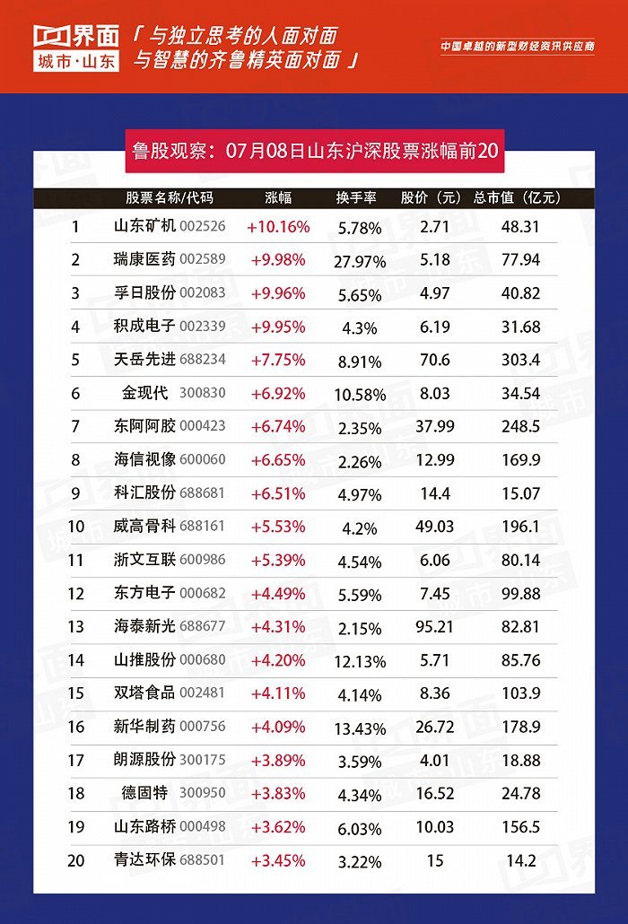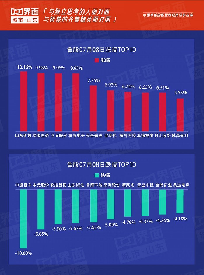原标题:鲁股观察 |7月8日:中通客车盘中跌停,山东矿机领衔132只个股上涨