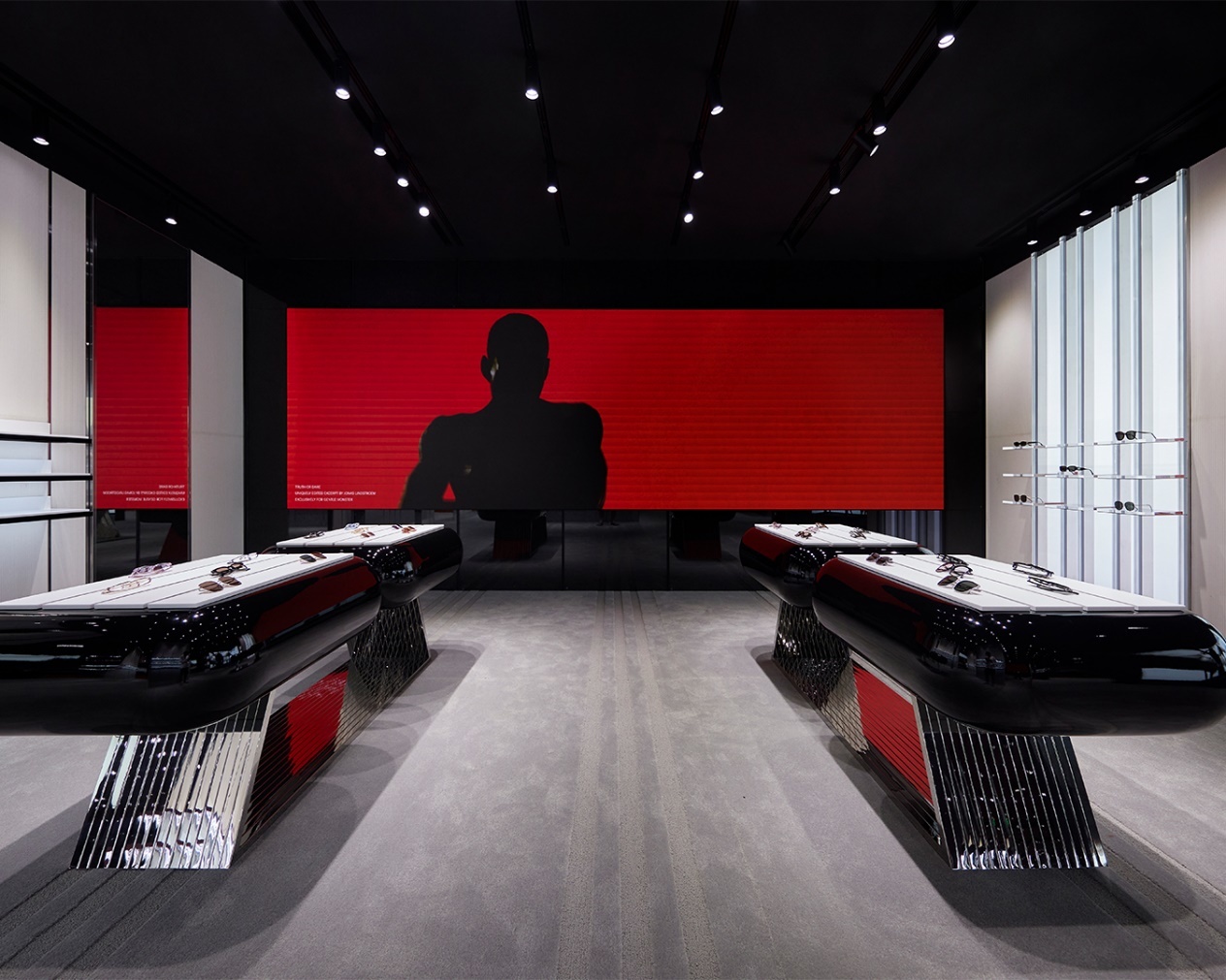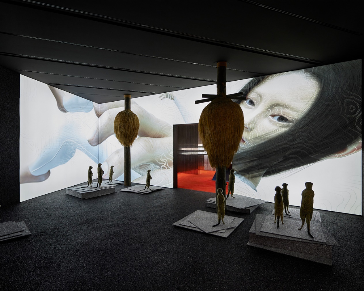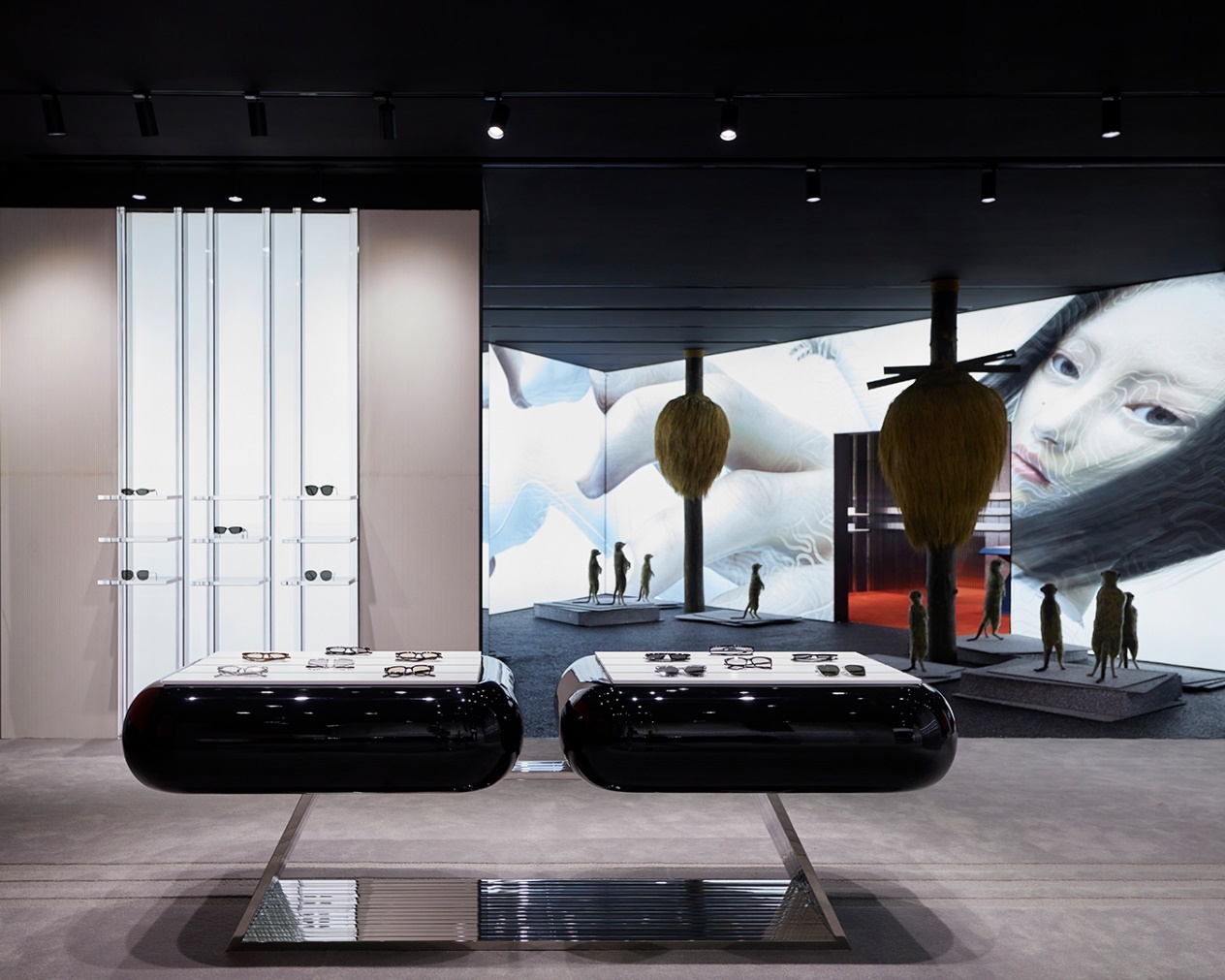步入店铺,GENTLE MONSTER打造了多维艺术感官空间,借由镜面装置和多媒体屏幕的结合运用,让来访者们在已知中探索未知。穿过陈列空间,突破常规定义的未来感艺术空间徐徐映现,通过现实世界中的狐獴与未知领域生物的对视与共存,以抽象视角带来无与伦比的沉浸式情绪体验。