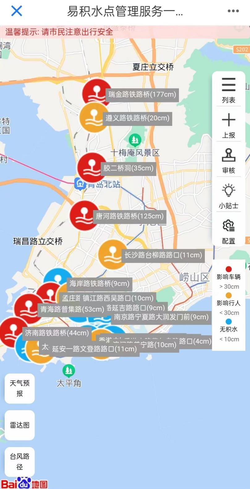 该程序以地图形式展示了当前易积水点位,并根据积水深浅分别呈现红色、黄色、蓝色等不同显示状态:红色代表积水>30cm,影响车辆通行;黄色代表积水<30cm,影响行人通行,蓝色代表无积水。例如,15日晚19时32分,城市积水地图就显示,瑞金路铁路桥积水深度达177厘米,唐河路铁路桥积水深度达125厘米,前海一线多处道路积水深度也已达10厘米以上。同时,市民还可点击地图左下角图例,一键查看天气预报、雷达图和台风路径,随时掌握外部环境是否适合出行。若在出行中遇到积水点,市民也可以通过该程序进行上报。