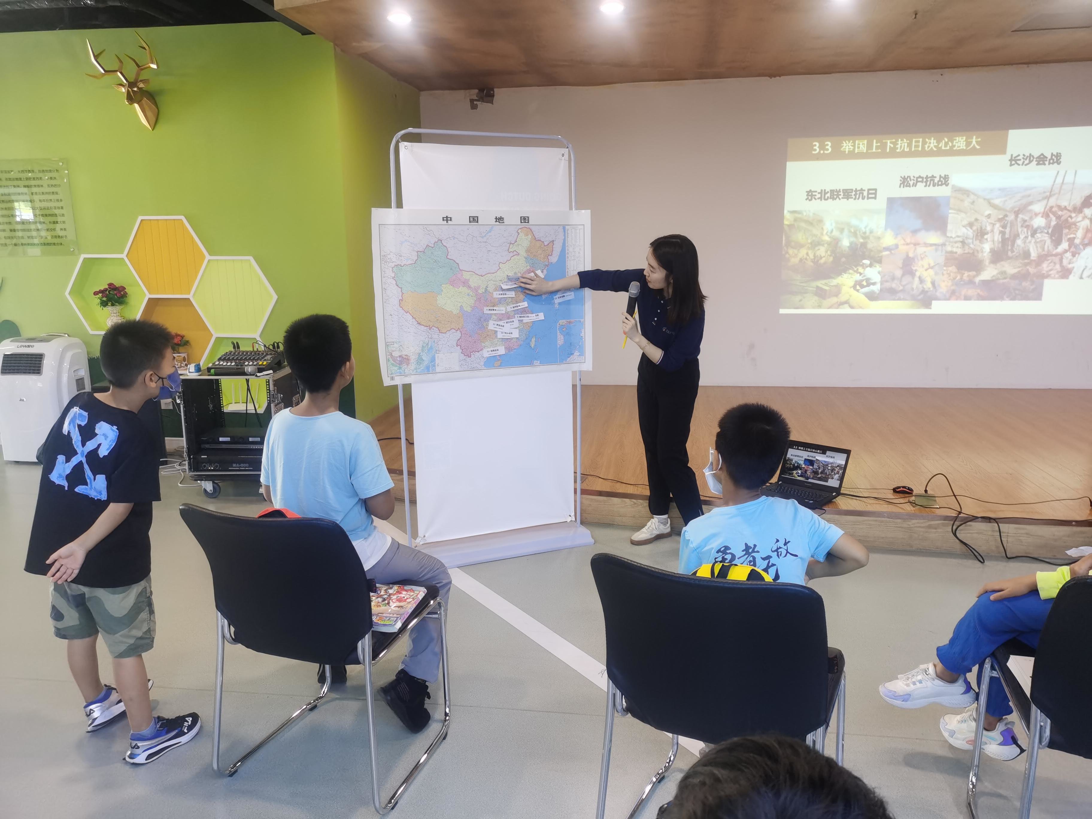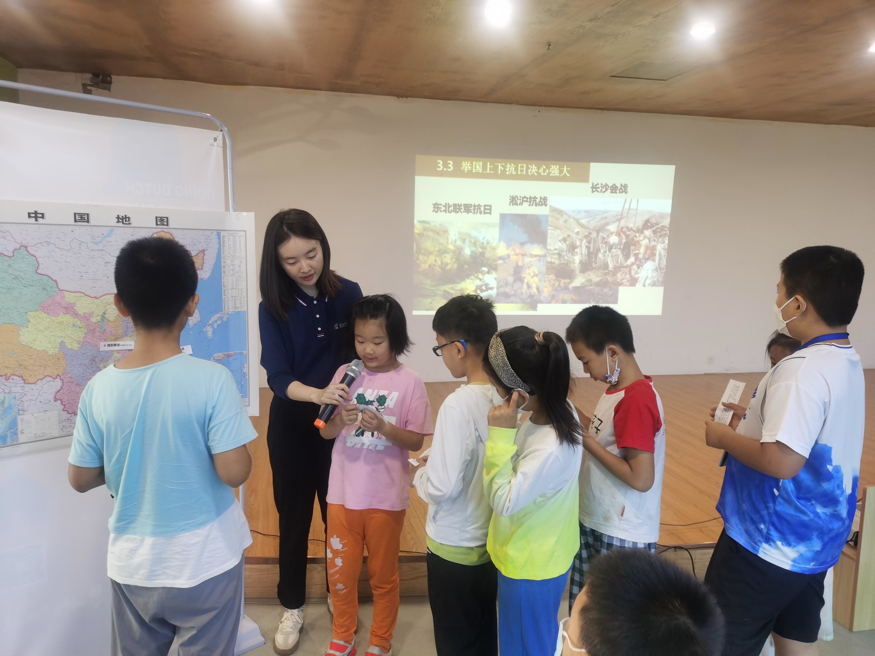 在最后的互动环节,小朋友们每人抽取了一张抗日战争期间重要事件的简介卡片,根据简介内容找到对应的事件名称卡片,按照事件发生地点依次贴在中国地图上。十几张卡片贴完后,大家直观地了解了抗日战争的局势,感受到万众一心、共赴国难的伟大精神。