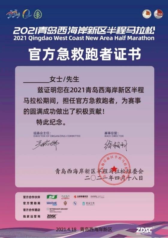 6、2022青岛西海岸半程马拉松赛后精美急救跑者个人荣誉证书。