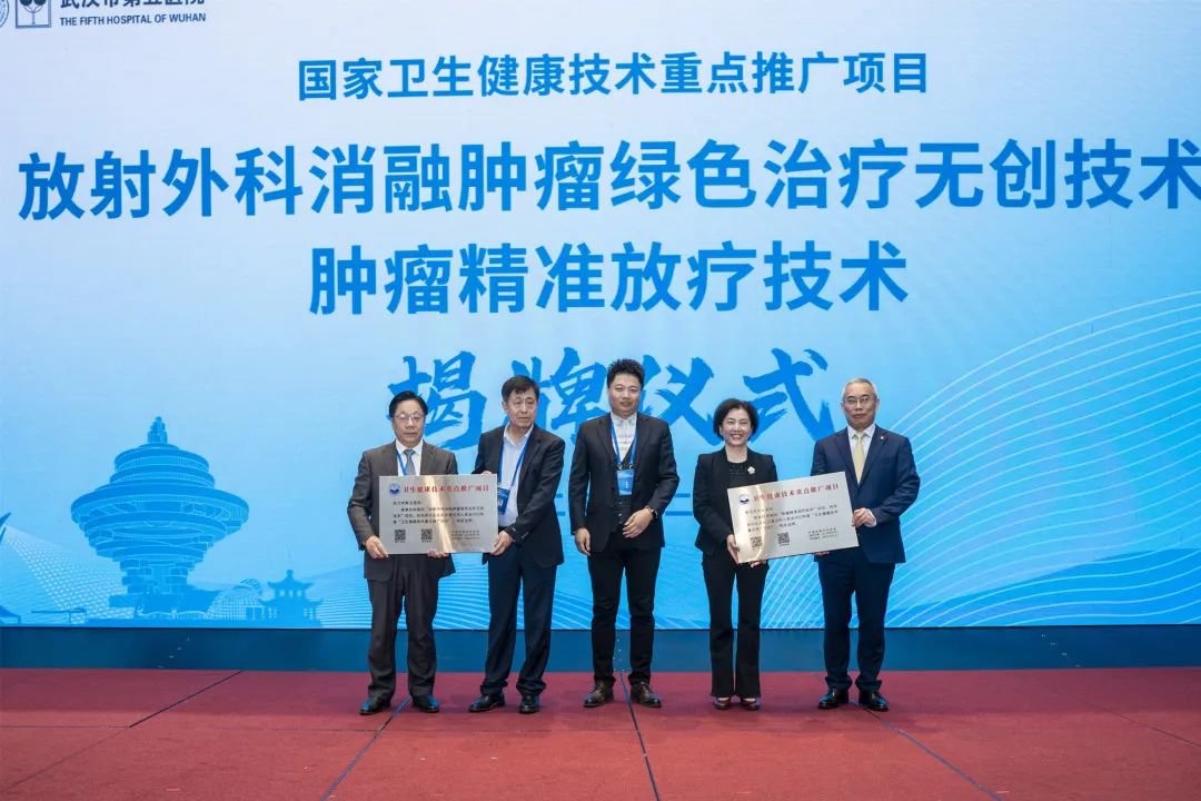 随后,中国民族卫生协会副秘书长蒋大伟宣读国家卫健委文件,带来了武汉市第五医院申报的国家卫生健康技术推广项目“放射外科消融肿瘤绿色治疗无创技术”和青岛市中心(肿瘤)医院申报的“肿瘤精准放疗技术”经专家论坛会论证列入“卫生健康技术重点推广项目”的好消息,并为两个项目进行了授牌。
