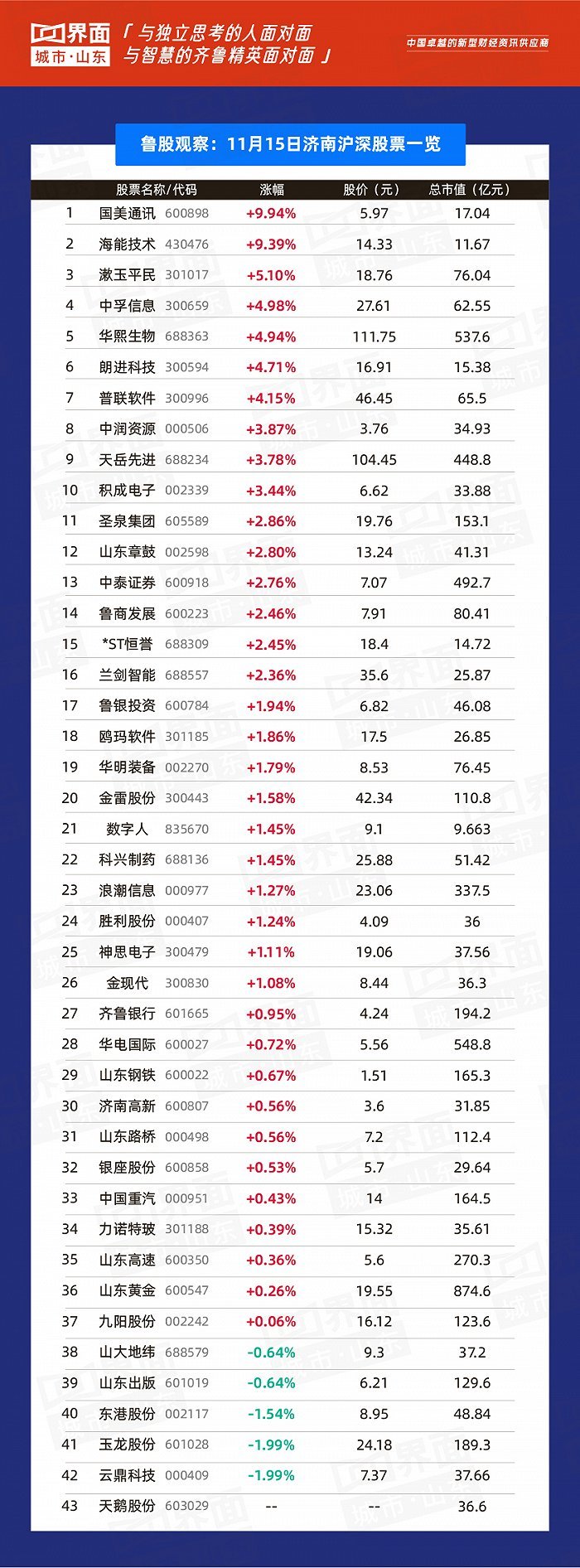 济南市涨幅榜首:国美通讯(430476),涨幅9.94%,股价5.97元,总市值17.04亿;