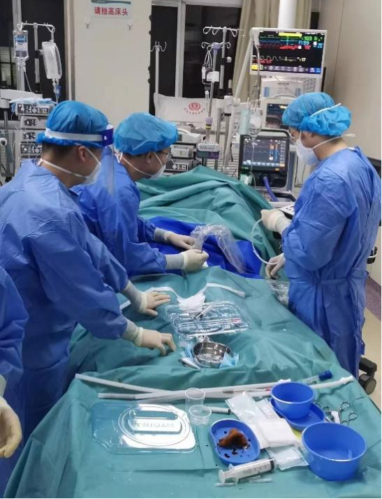 患者是一名60岁女性,突发上呼吸道感染症状,两天后即出现高热、胸闷等症状,胸部CT检查提示双肺大片磨玻璃阴影。患者收入病房后突发意识丧失,呼吸心跳停止,青大附院的医护协同抢救5个小时,终于将患者从死亡线拉回,而后送入监护室等待进一步的治疗。