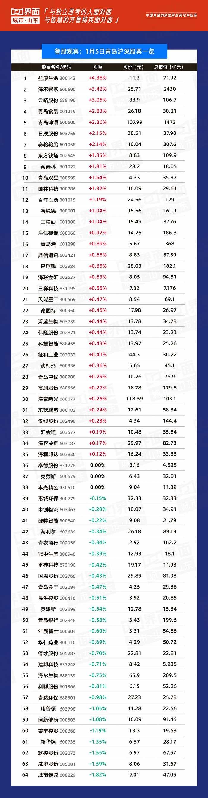 青岛市涨幅榜首:盈康生命(300143),涨幅4.38%,股价11.2元,总市值71.92亿元;