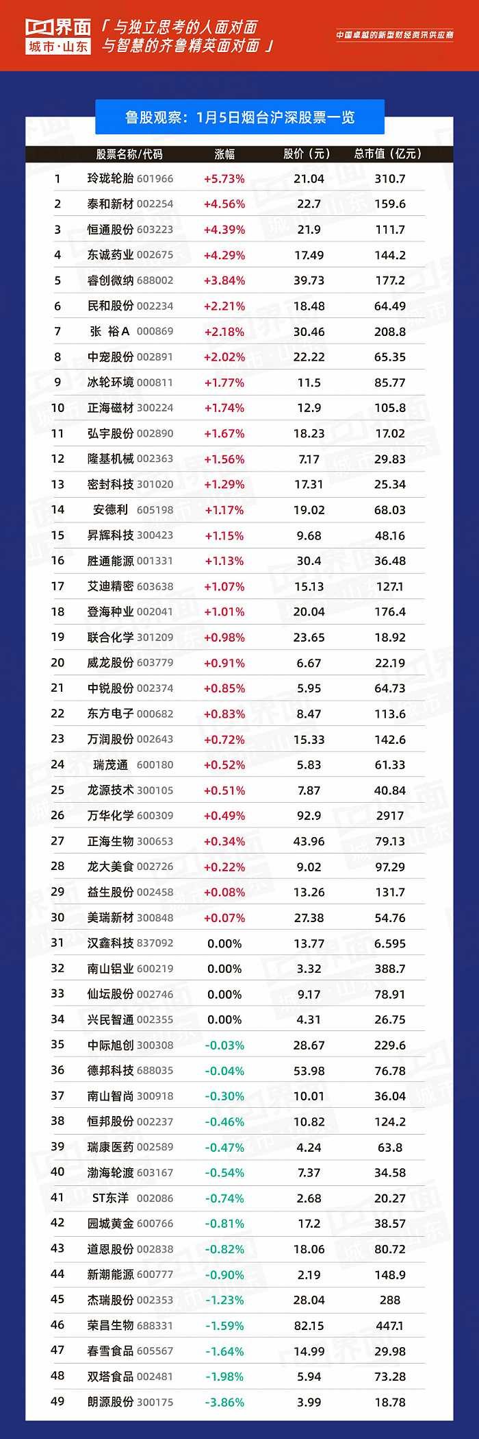 烟台市涨幅榜首:玲珑轮胎(601966),涨幅5.73%,股价21.04元,总市值310.7亿元;