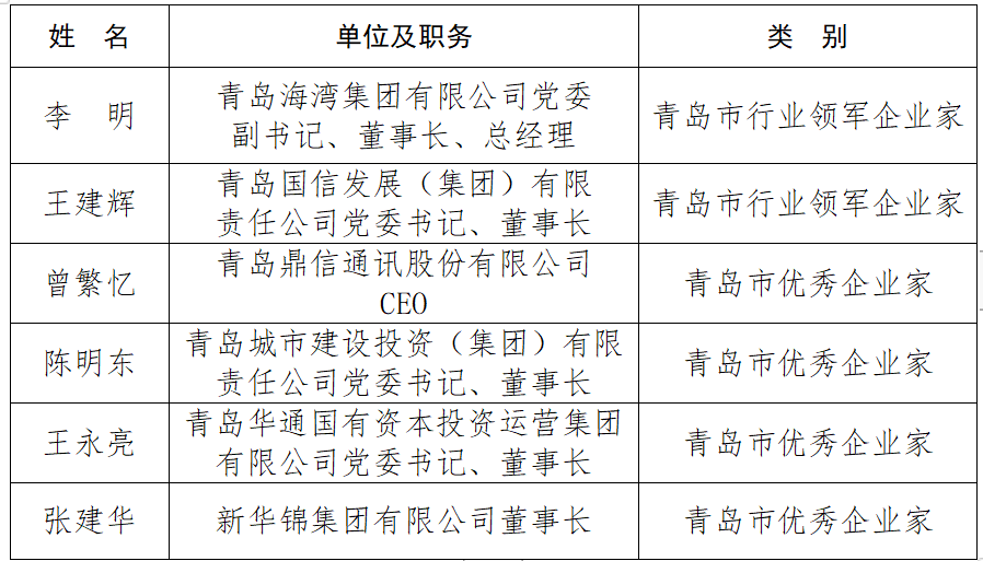 6名人选中,2人拟认定“青岛市行业领军企业家”(全市10人),4人拟认定“青岛市优秀企业家”(全市30人)。