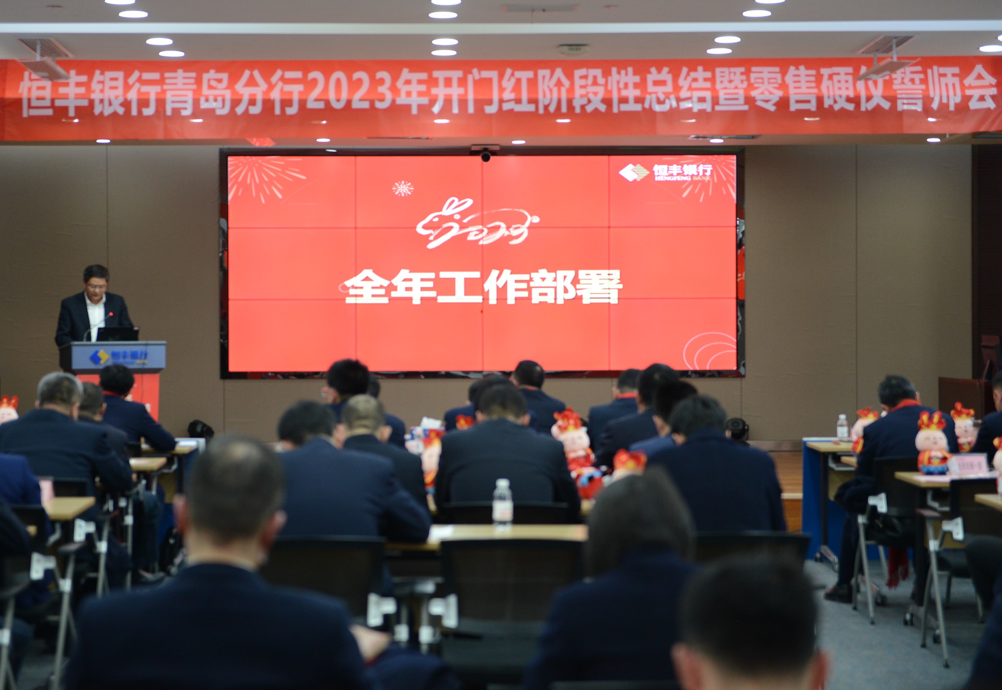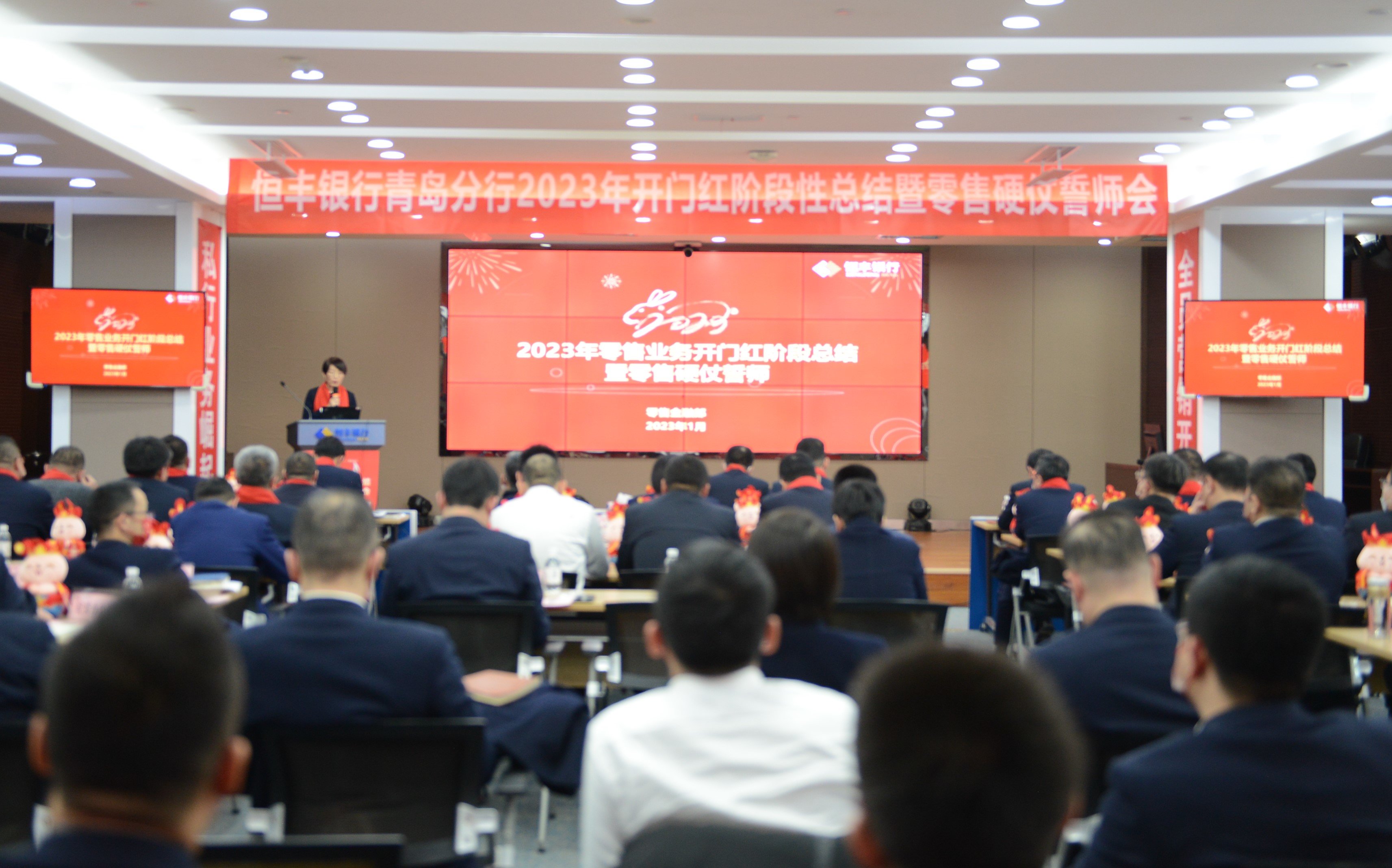 1月29日下午,恒丰银行青岛分行召开2023年“开门红”阶段性总结暨零售硬仗誓师会。分行行领导,各二级分行、各支行主要负责人、分管行长,零售条线、普惠条线全体干部员工,分行各部室负责人,受表彰个人及单位代表等参加会议。