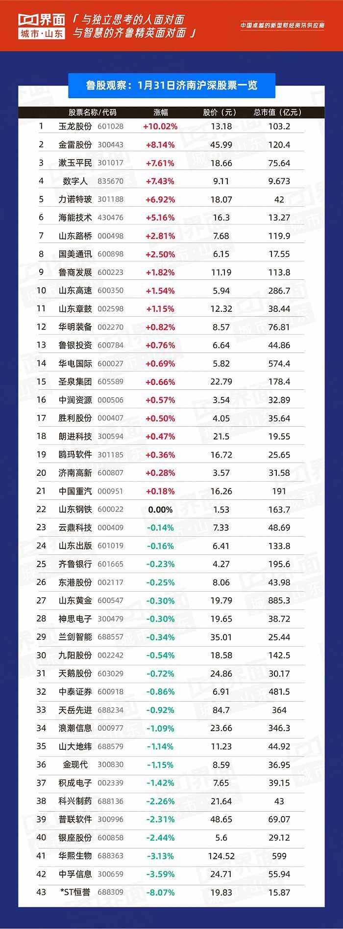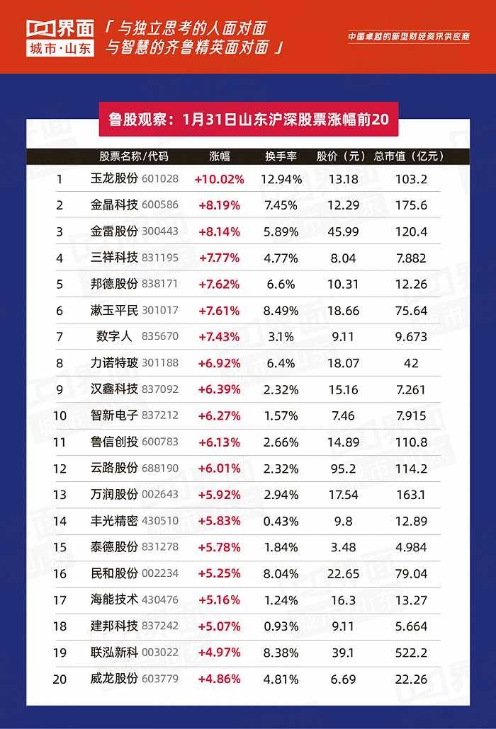 济南市涨幅榜首:玉龙股份(601028),涨幅10.02%,股价13.18元,总市值103.2亿元;