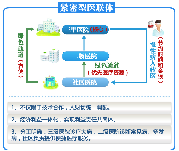 医联体,即医疗联合体,是指将一定区域内的医疗资源整合在一起,通常以区域内的三级公立医院为核心,联合二级医院、社区卫生服务中心等医疗机构组建而成,居民可就近选择在基层成员机构首诊,逐级转诊。