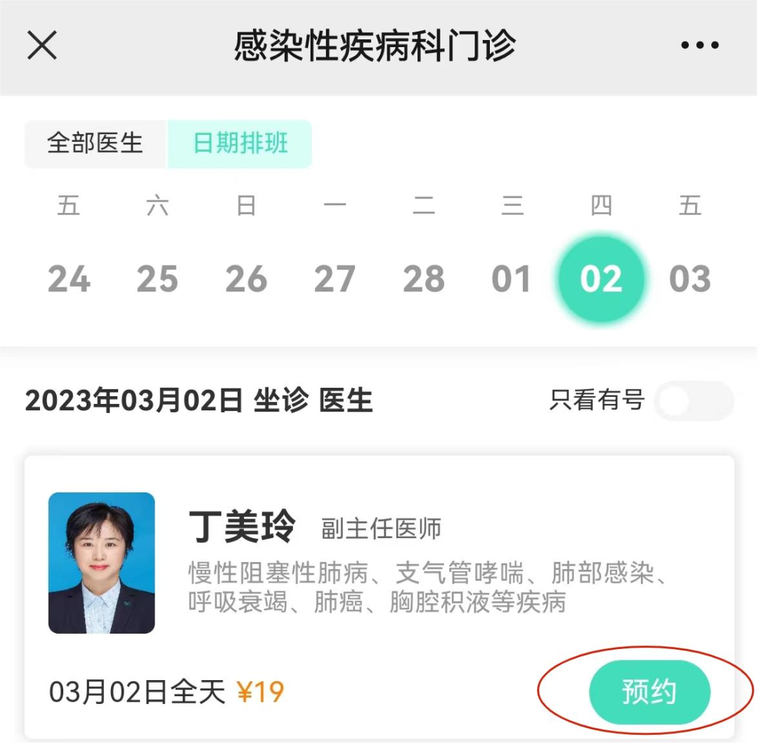 2、点击菜单栏中的“诊疗服务—就医服务—挂号/预约—查看全部医生—内科—感染性疾病科门诊”,根据您合适的就诊时间,进行预约。