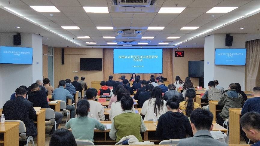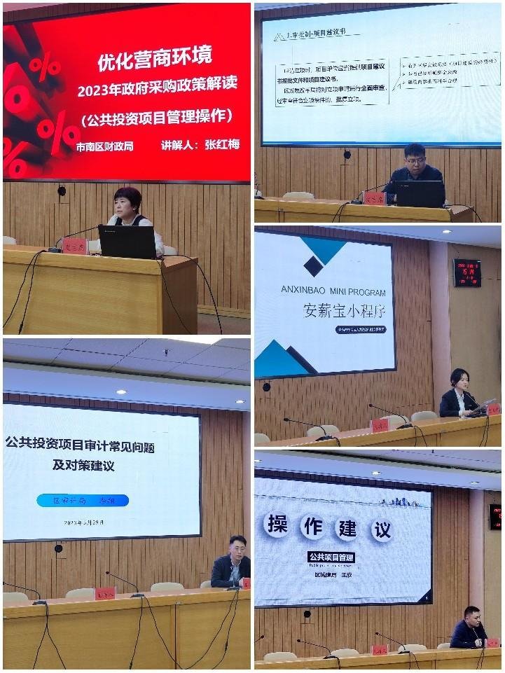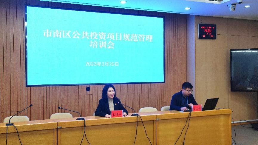培训会围绕最新印发的《市南区公共投资项目管理操作建议》,从规范公共投资项目立项工作、优化营商环境落实政府采购政策、保障农民工权益、公共投资项目施工管理操作建议、公共投资项目审计常见问题及对策建议等五个部分开展培训。