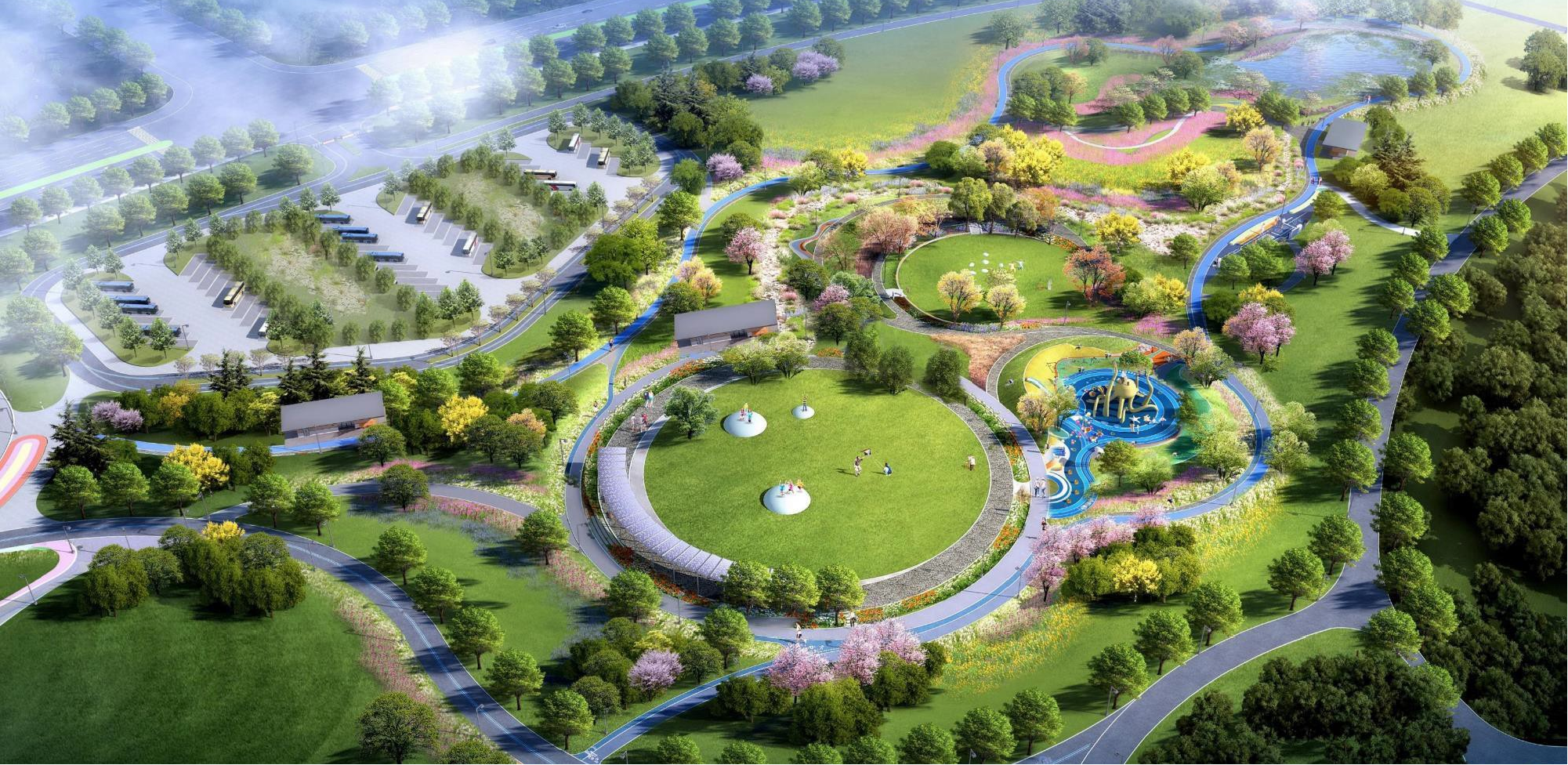 该项目设计以“一轴两翼”为构架。其中,一轴为水生态主题的中轴,包含生命探索园。左翼包含假日露营地、派对草坪.右翼以亲子体验为主,包含自然童趣园和运动冒险园。旨在打造绿色生态迎宾走廊和重点门户景观节点。