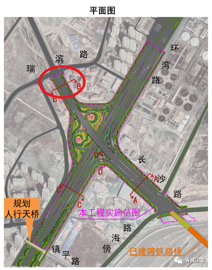 下图是2020年环湾路与长沙路立交桥的规划图,位于欢乐滨海城的这个圆圈可能就是胶州湾第三海底隧道的起点: